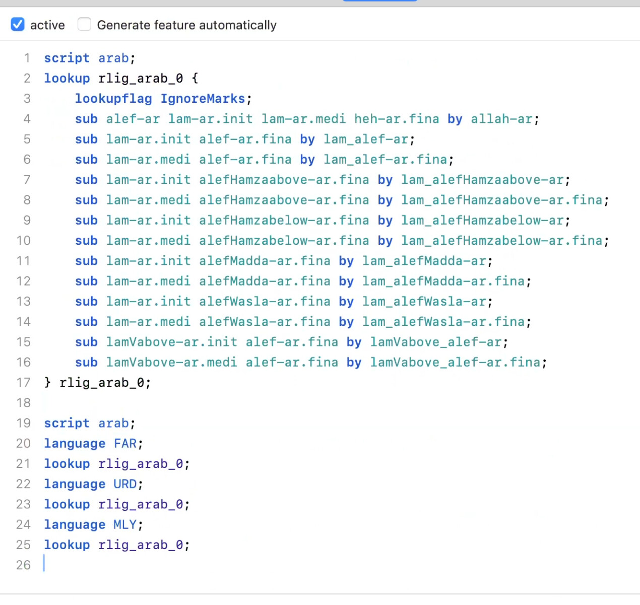 I was looking at what I could do for my current font to keep the auto generated rlig, which currently includes the script arab at the top so all my additional languages don’t form the ligature without some intervention on my part. I can either add those lines to a second rlig that has some additional OT (along with calls for all the additional lookups in rlig), or remove auto generation to delete the script arab line. I would definitely prefer that the script requirement be removed in the auto rlig OT ![]()
