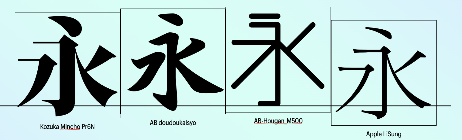 The ideographic character face metrics (‘icft’ and ‘icfb’) are to be used as stand-ins for the “average” ideograph’s bounding box. These can then show what size ideograph (relative to the embox) with which a given font is designed to be used. Kana-only fonts could include these BASE table entries. When included in a font containing ideographs, the entries are useful to characterize the average character face of the ideographs quickly and allow for use in grids or other glyph alignment scenarios.