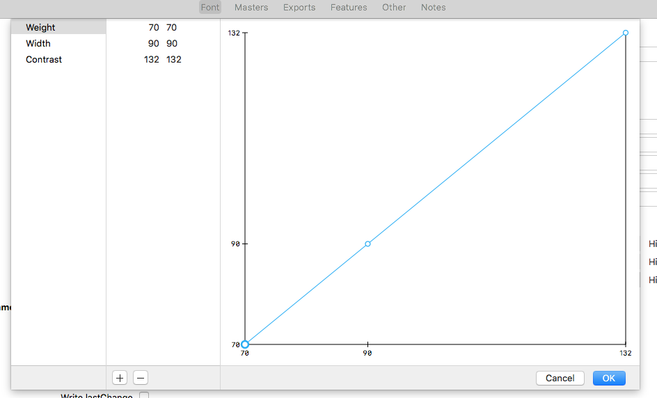 The numbers are the internal master values. Shouldn’t one of those columns correspond to the Axis Location parameters? Otherwise I have to figure out what e.g. 80 corresponds to when 70 is axis location 300, 80 → 450 and 132 → 800. Of course 80 → 375, but I want it to be at 400, so I have to find out how normalizing the axis positions works … that is just one step short of coding the avar table manually.