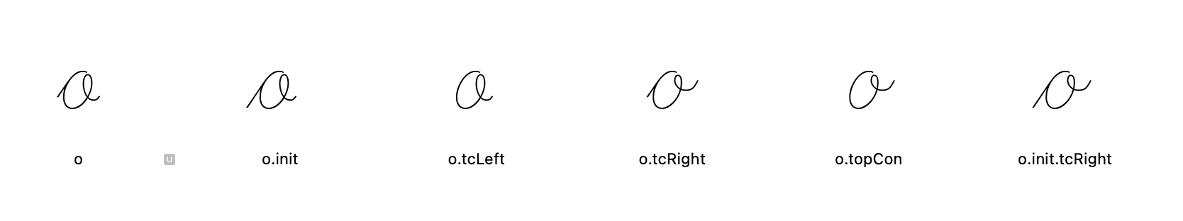 I’m having trouble figuring out how to make the calt feature work for a connecting script. My regular letter forms are connecting in the middle — no problem there. I have initial and final forms, then I have some top connecting alternatives I would like to have with the calt feature. They are divided into three classes: tcRightSub (forms that connect top right), tcLeftSub (connect top left), topConSub (forms that connect both top left and top right). Here’s the example with the letter o: