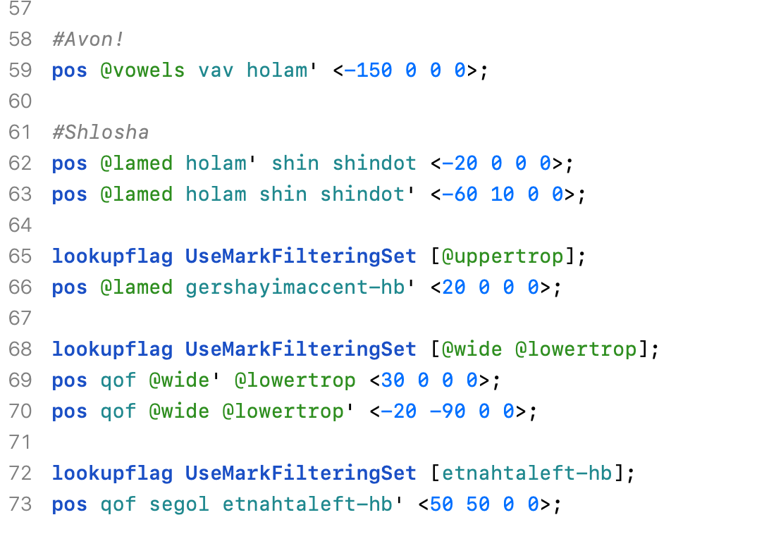 now, I have an interesting situation with the letter qof where there isn’t enough space for the trop so I have creating a pos in the mark feature using the mark filtering set to take into account the dagesh (aren’t you proud):