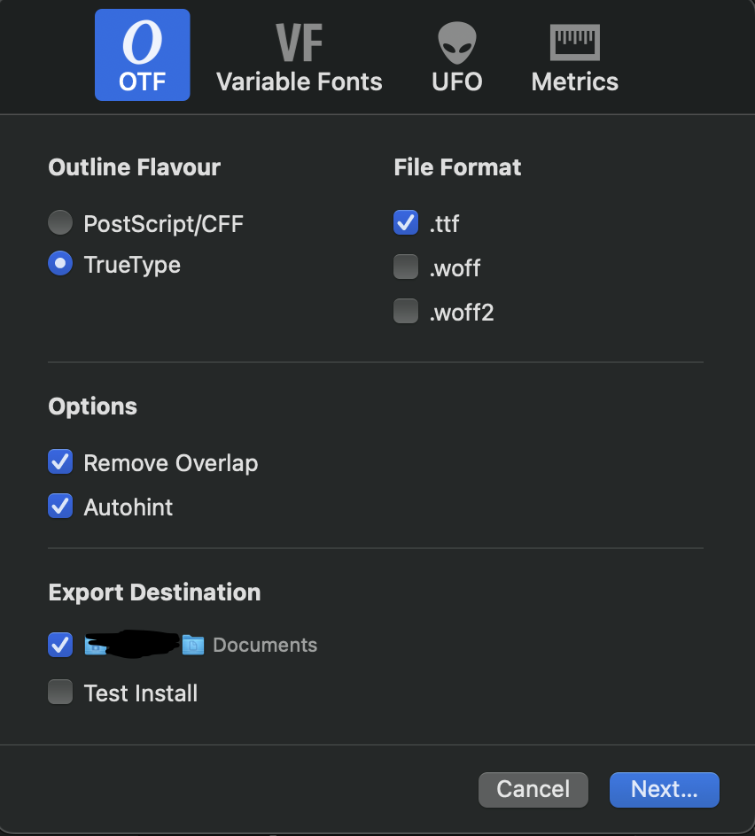 Just did that, thank you. How do I convert it back to a .ttf file so I can add to the Font Book? I tried exporting with these settings and clicking Next, but nothing happened.