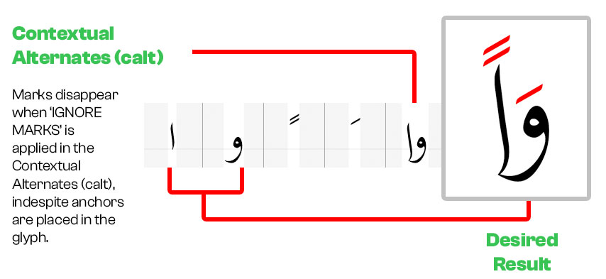 I am working on a book for children with colored diacritics using InDesign GREP style as it doesn’t support CPAL/COLR, my problem is that I have custom glyphs with marks inside it, and I used the Contextual Alternates (calt) feature to generate my custom glyph and I correctly placed anchors on the ligature. The desired glyph I want is like this: