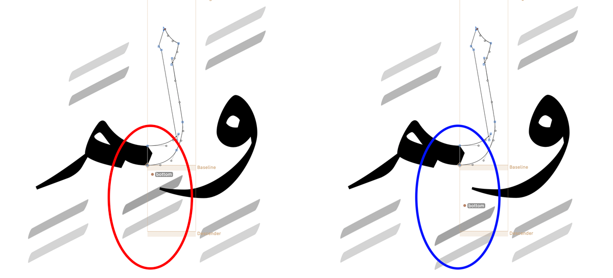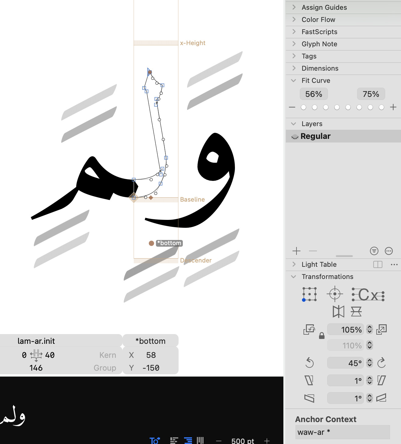 Now, this *bottom anchor is used instead of the regular bottom anchor when the glyph is preceded by the glyph waw-ar. You can also make it work for waw-ar.fina by using the following context code: