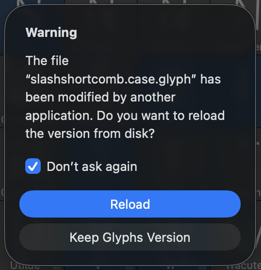 This dialogue pops up all the time when I change data externally while I have the document open in Glyphs.
