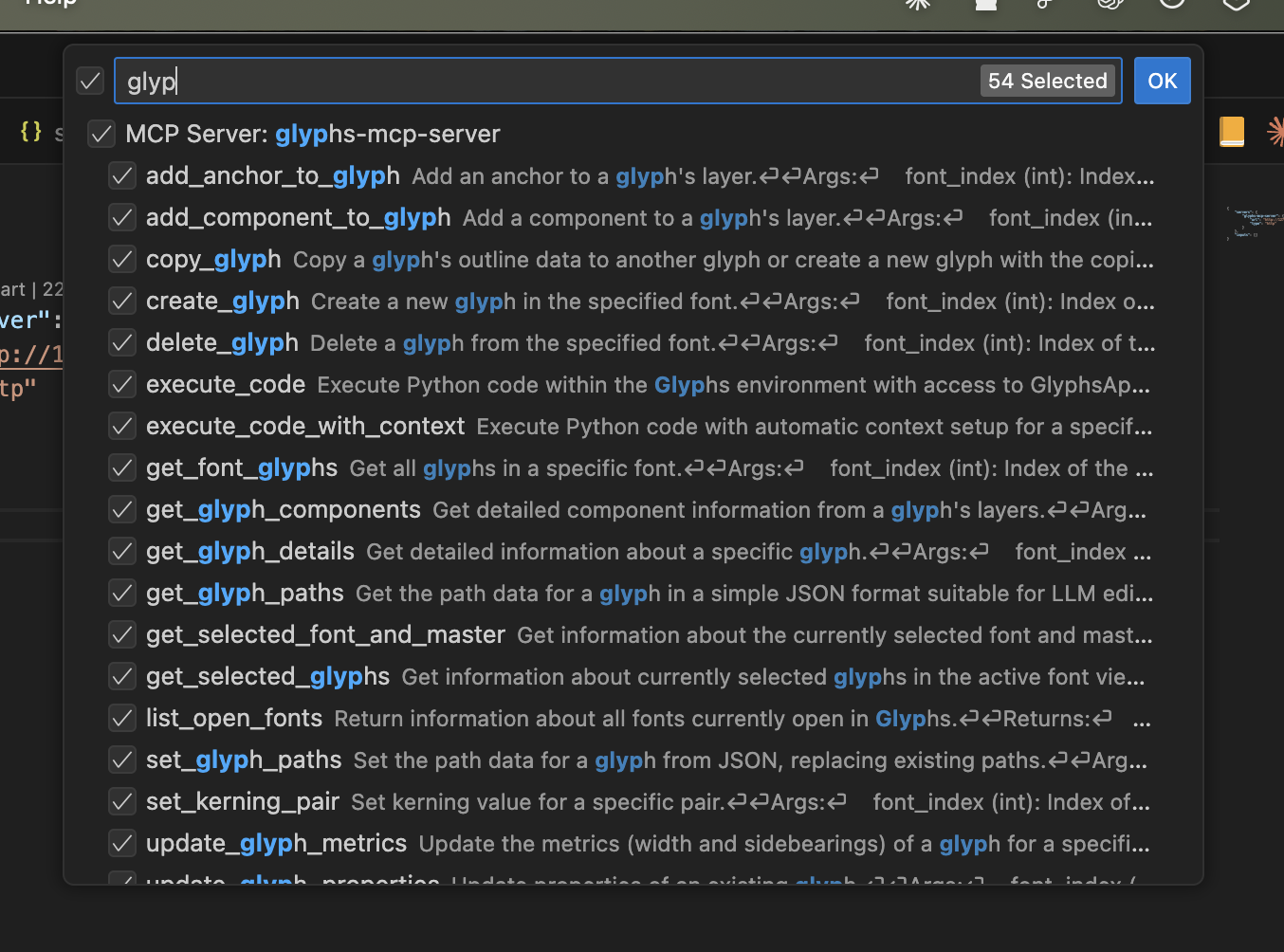 I’ve put together a very small Glyphs plugin that lets you spin up (or shut down) a local FastMCP server straight from the Edit menu: