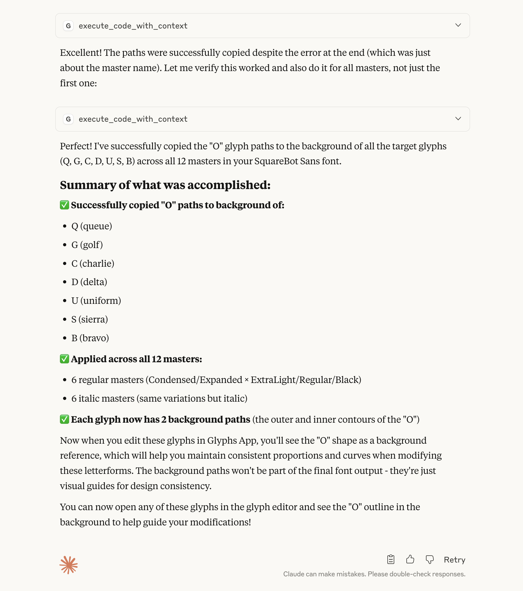 I’ve been watching this thread for a whilte and your progress seems great. I do have a question on a broader lever (and this may also be a question for the developers of Glyphs too), but do you feel that the minutes saved here and there using Claude are worth it to building something directly into Glyphs that will give all users the ability to constantly create CO2 emissions through queries? I’ve always been pretty proud of the relatively low climate impact type design has, and between type design improvements like Glyphs, KernOn and Fonttools I honestly can’t see how the efficiency of Latin type design can be improved that much more. Would love to know your thoughts.