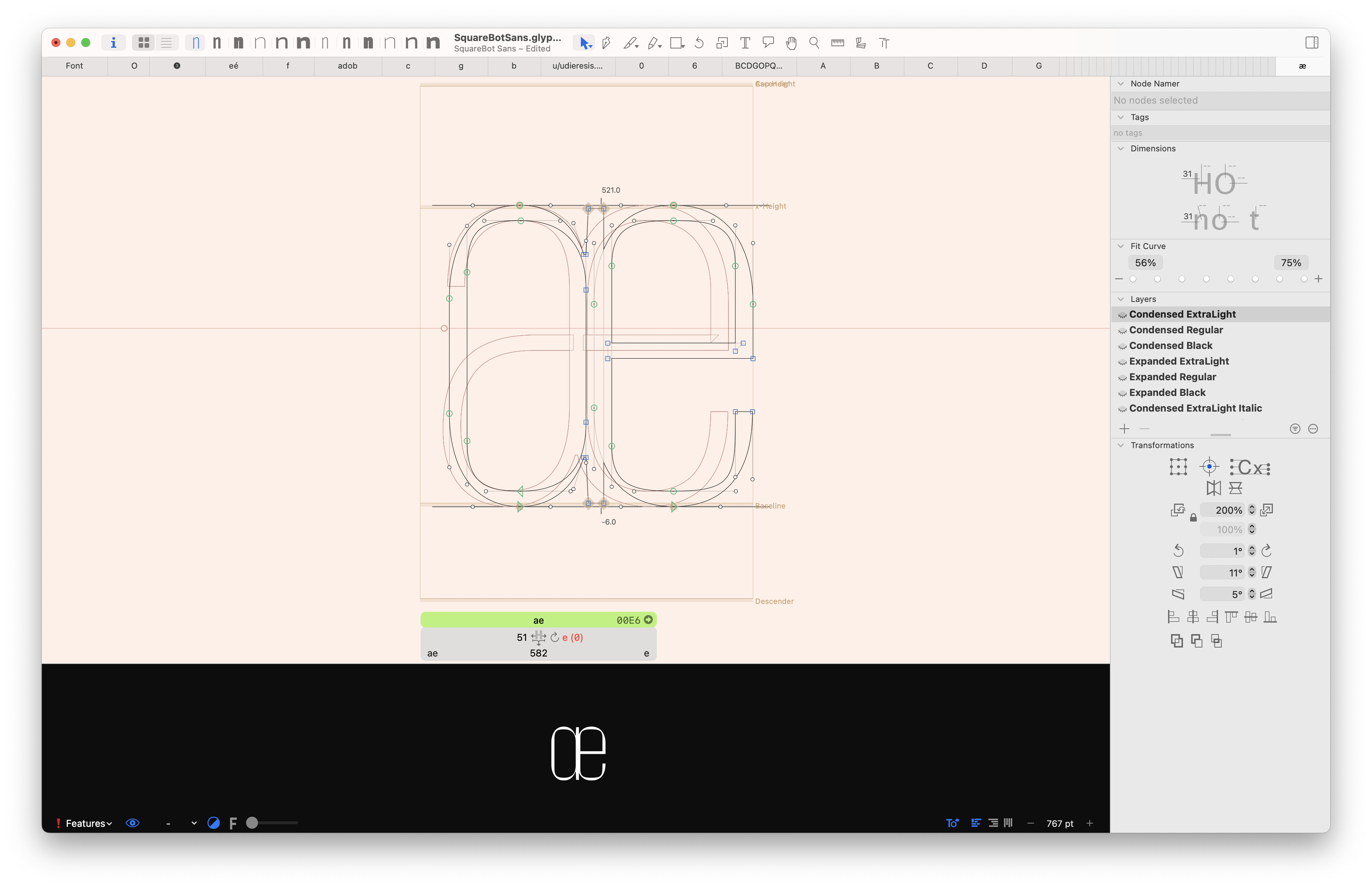 Copy the path of the “a” and “e” in the background of the letter “ae” in every master. Translate the path of the “e” aligned on the right of the letter “ae”.