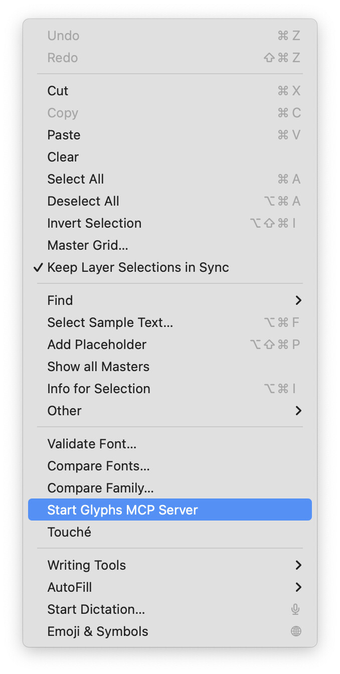 Has this been tested in Tahoe 26.0.1? I have not been successful in getting the server to show up in Edit > Start Glyphs MCP Server. More likely I missed something but I have to ask.