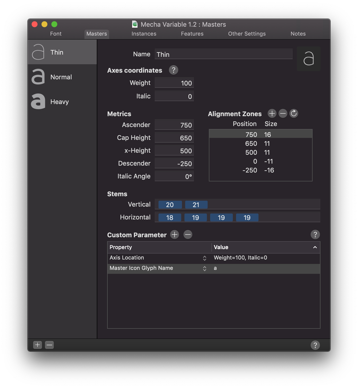 I recently recreated my font family “Mecha” as a variable font, which now has 2 files, for upright and italics, each with 3 masters—Thin, Regular, Heavy—withweight axis. For the Italic axis, The upright masters have a value of 0, and italics 1, and I have indicated Weight and Italic axes in both files.
