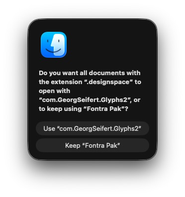 Do you want all documents with the extension “.designspace” to open with “com.GeorgSeifert.Glyphs2”, or to keep using “Fontra Pak”?