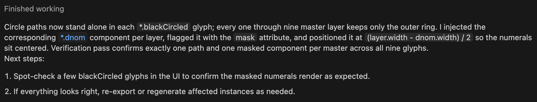 “In every .blackCircled glyph — from one.blackCircled to nine.blackCircled — remove the second and third paths if they exist. Then add a component of the corresponding .dnom glyph (for example, add one.dnom to one.blackCircled). Set this component as a mask and center it horizontally. do it on every master. Glyph by glyph.”