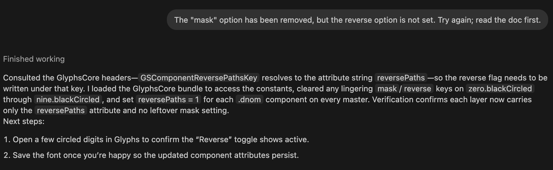 I have created a new prompt with a reinforcement on the documentation to give more direction as the MCP set has access to a portion of the Glyphs app documentation.
