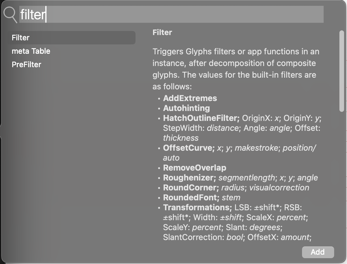 Hi, @SCarewe. Maybe I didn’t explain the situation well. Just like these filters (i.e. Roughenizer) are actually running scripts under the hood and applying them to instances, I was wondering whether I could apply a script of my own instead of the default supported by glyphs (see screenshot).