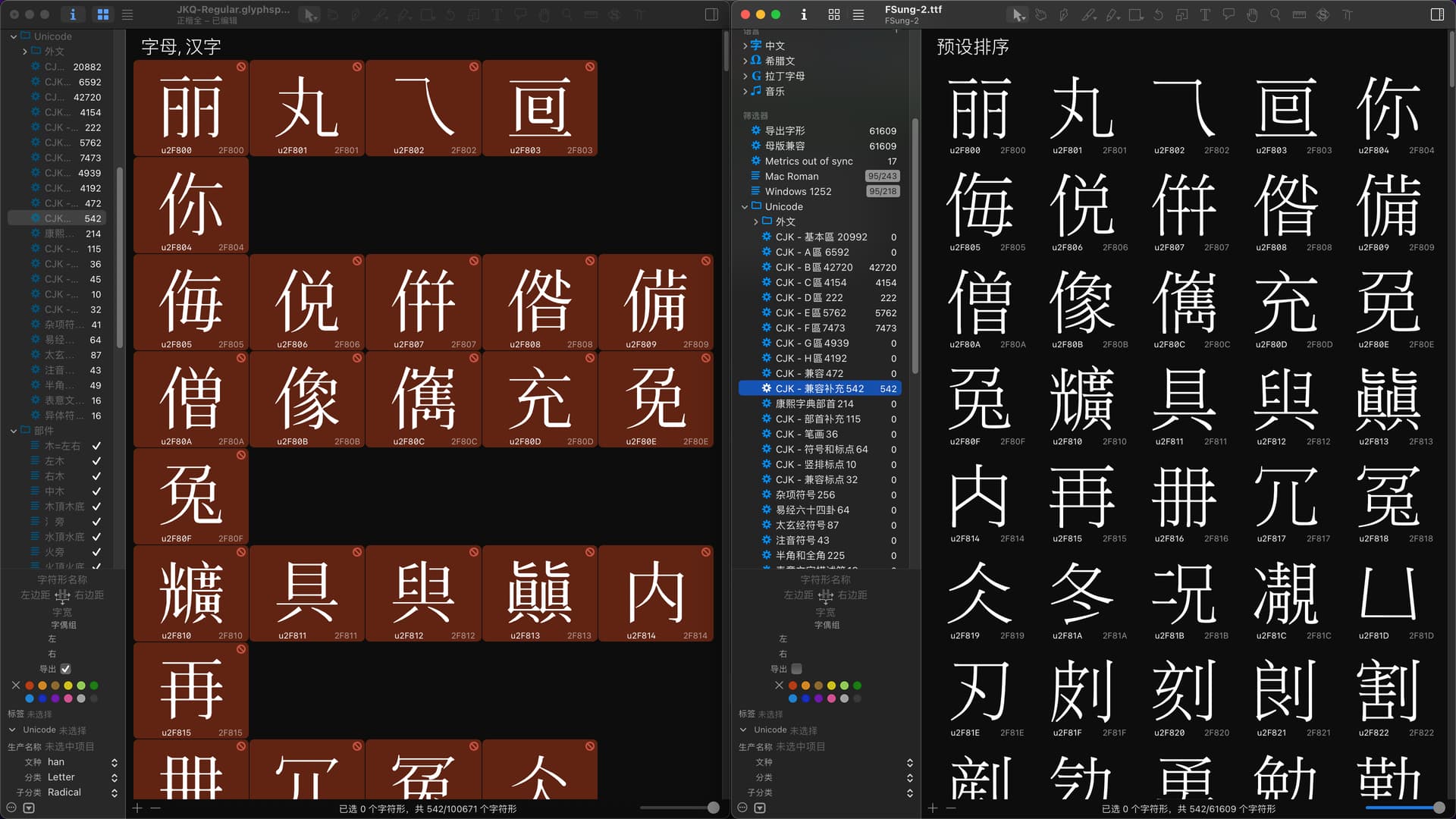 What I want is the effect in the attached picture, Chinese characters in the same unicode block, the characters in the two fonts are sorted by unicode, and then the subtle differences in their outlines are compared.