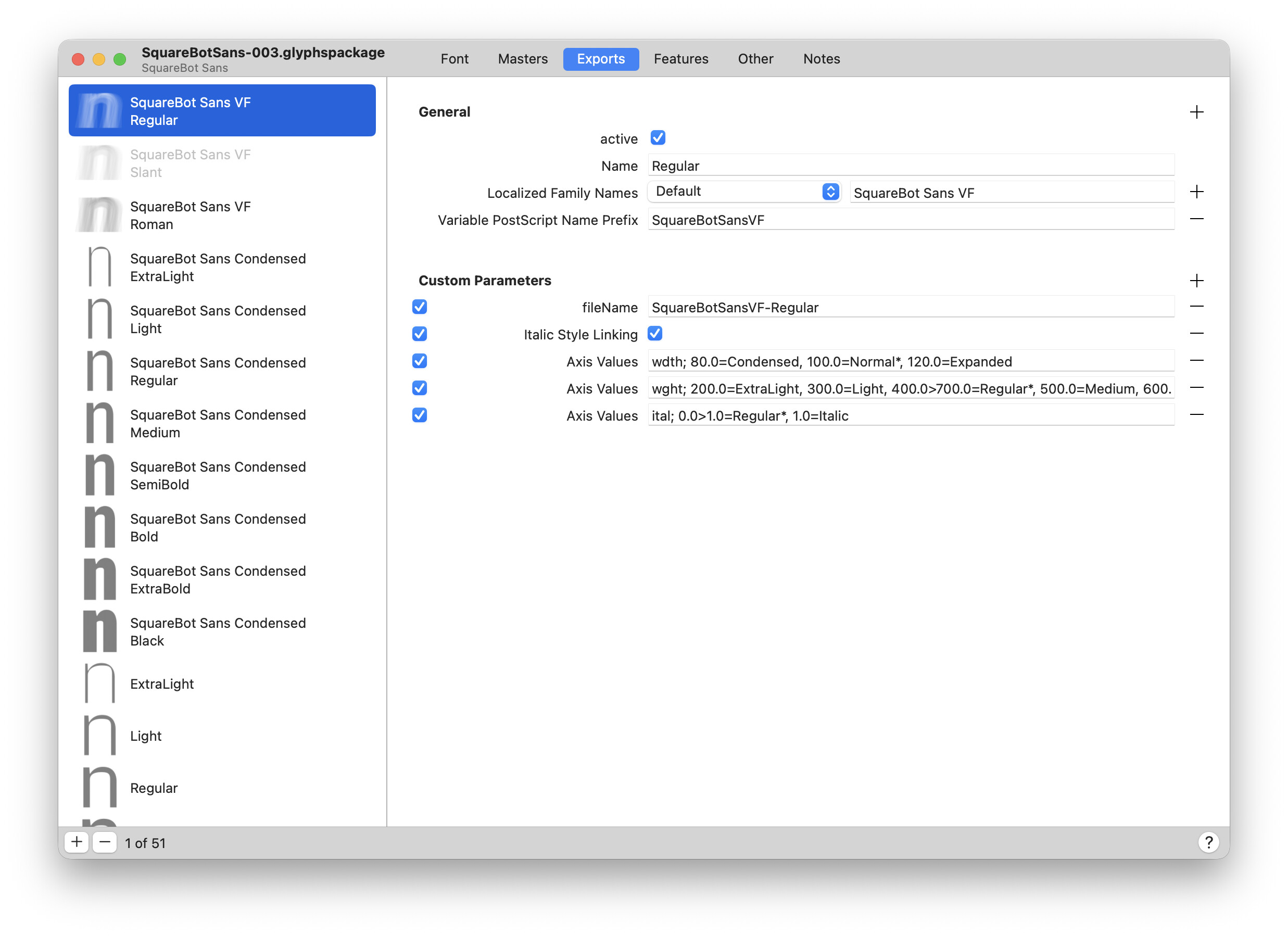 I’ve set up 3 axes, but the italic is not ready yet. I’d like to have two export setups: