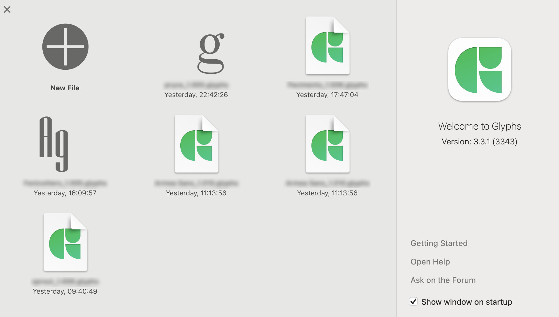 I wonder if anyone can help. In the startup window, with families I started recently, they behave as they should and show the Ag icon in the correct font. On fonts I started a while back, they just show the Glyphs application icon. I cannot get them to display the font. I have tried doing a save as and still no joy.