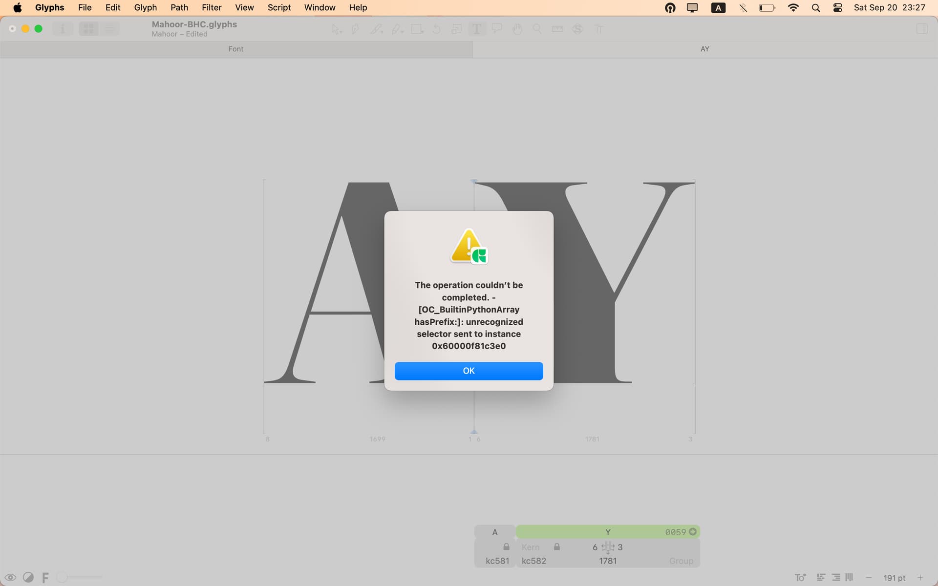 classes created in Glyphs app without any kerning values. kernings window show no kerning and i got this error when i trying to save the file:
