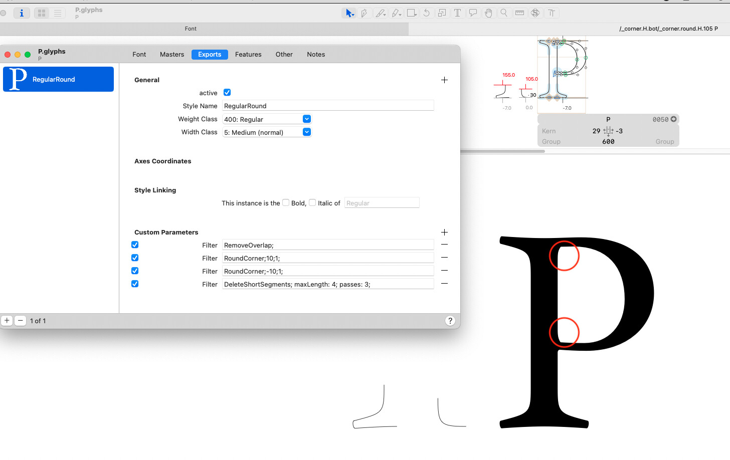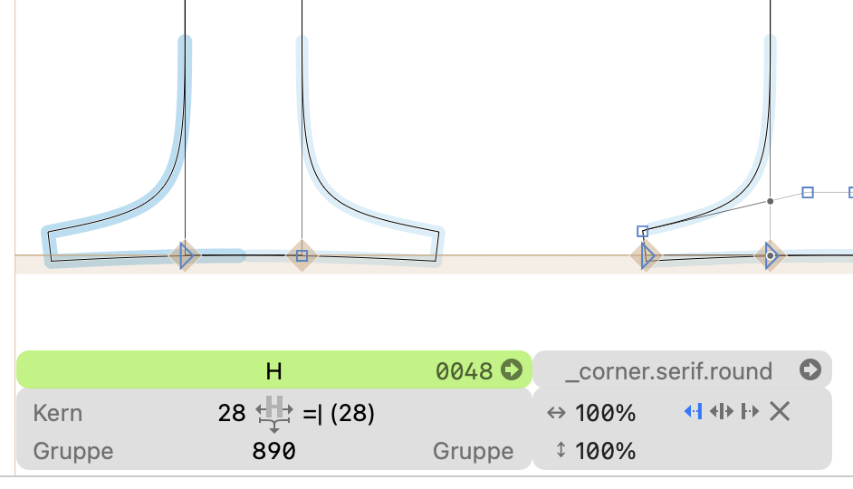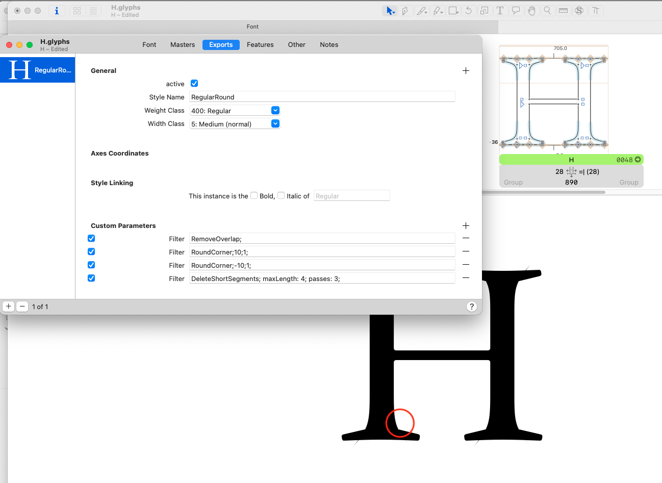 In he “H” file, the RoundCorner filter for the inner curve is confused by the almost flat connection that appears in where the first corner is connecting to the serif. I would suggest a different setup for the serif. Make one _corner that contains the full serif: