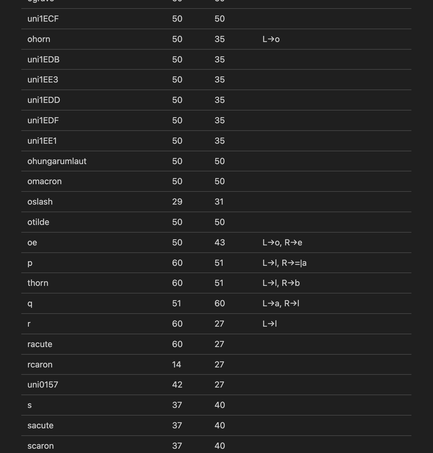 Yesterday, I had a disaster working on a new font. Somehow, my spacing went haywire. It may have been involved with the Mekkablue plugin to increase sidebearings, but I am not sure. At any rate, I am trying to recover all my data. I have found a backup file, but lt is tedious to retrieve data from the views available. I would love it if there was a list view showing each glyph with both sidebearings in a tabular view.