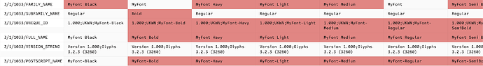 Then, when you click on the “name” table row, you can see if there are any name table entries that are identical in the fonts. Especially the combinations of FAMILY_NAME and SUBFAMILY_NAME should be unique, and each FULL_NAME, POSTSCRIPT_NAME, and TYPOGRAPHIC_SUBFAMILY_NAME should be unique per family.