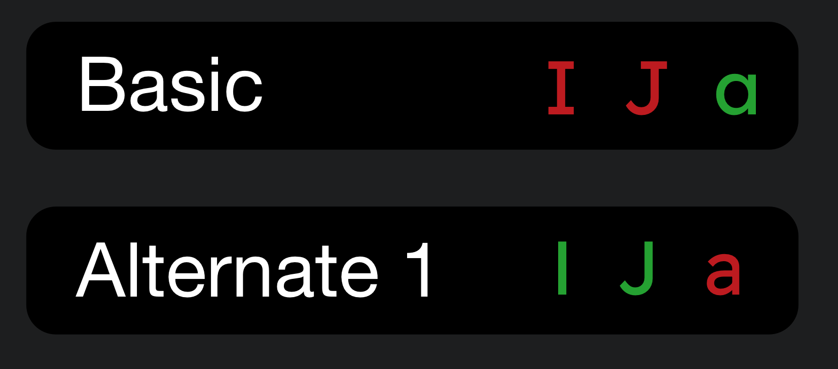 What should be done in the font though is separate stylistic sets. So the I, J and a alternates should have three different .ssXX suffixes, then update and compile the code in File > Font Info > Features. Definitely better to do that in the source.