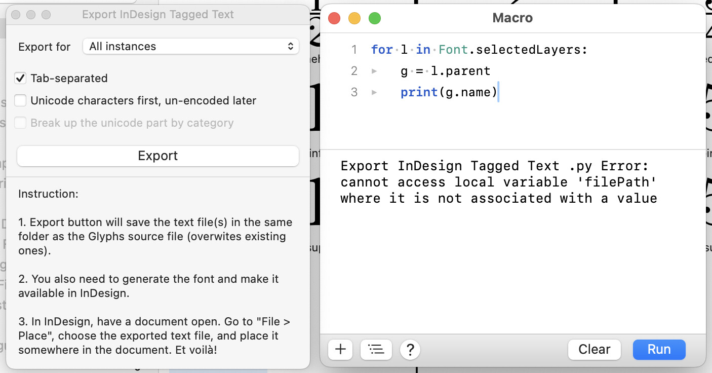 I have recently been using Toshi Omagari’s script to export a full set of glyphs in a font. It’s been great. But today it started giving me this error and I have no idea how to address the underlying issue. Does anyone know what to do to clear out the export error?