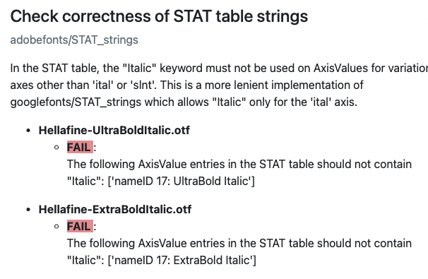 Check that related Upright and Italic VFs have an 'ital' axis in the STAT table.
