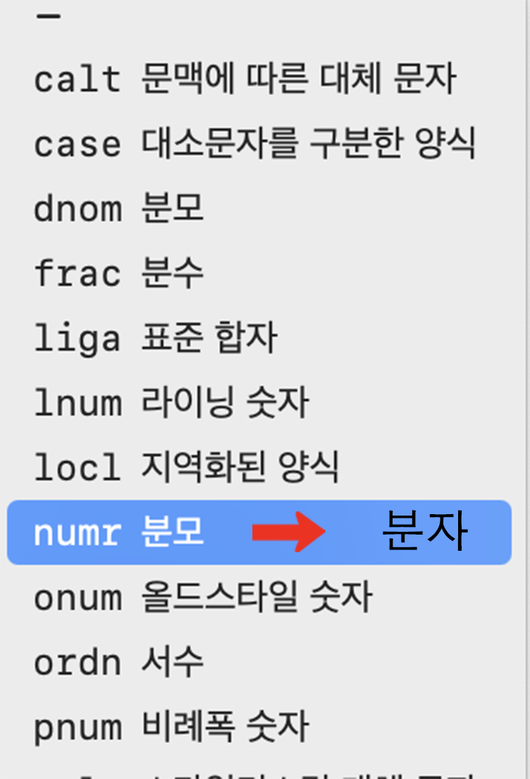 However, ‘numr’ should be labeled ‘분자’, where ‘자(U+C790)’ means ‘child’.