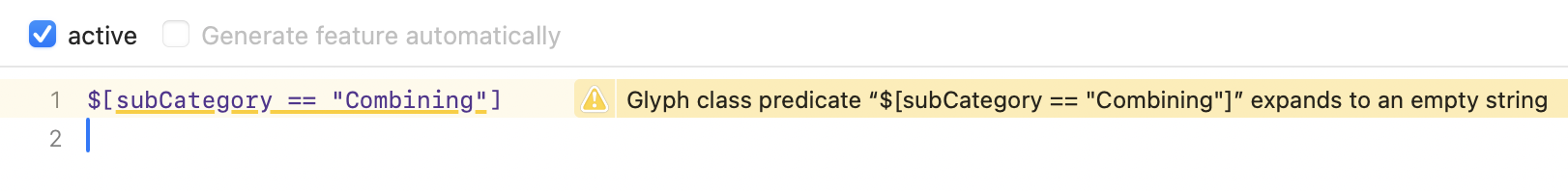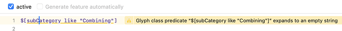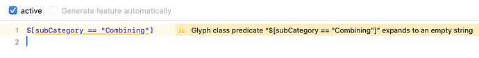 Are you sure you have glyphs what have the subCategory set to “Combining”? Just for the sake of testing, try $[category == "Letter"].
