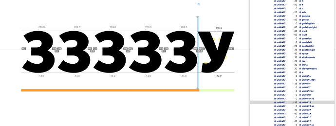 If I keep navigating through more pairs with dotted glyph names, the preview line keeps growing longer, as more copies of the left glyph are added.