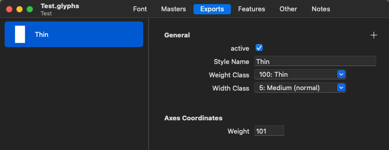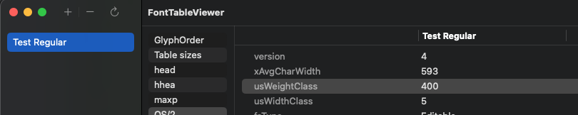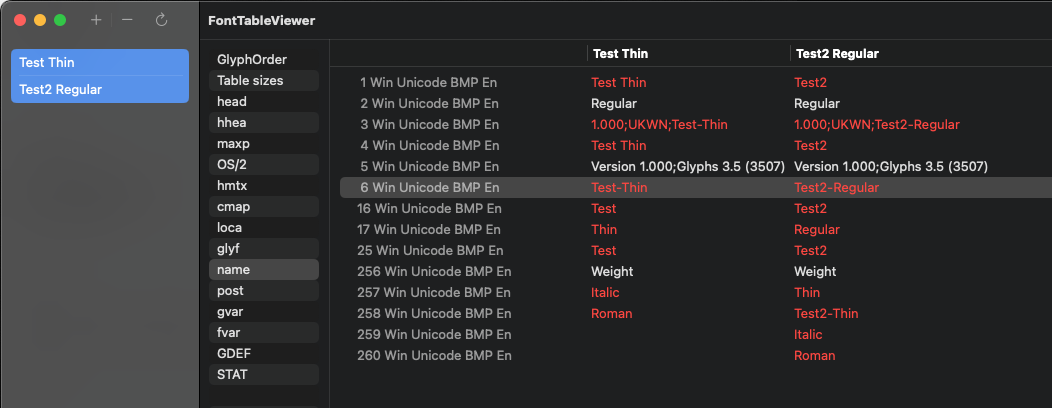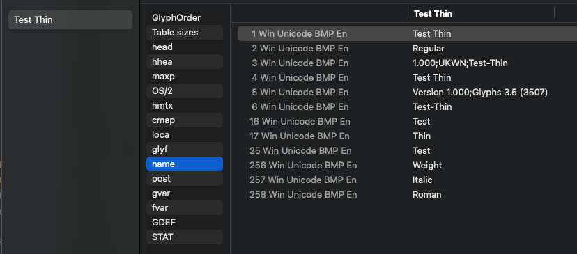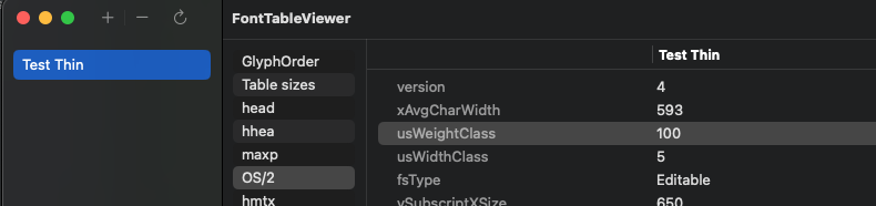 I have created a copy to show how it differs in FontTableViewer. Test Thin is with Instance Weight=100 and Test2 Regular is weight=101. The only difference.