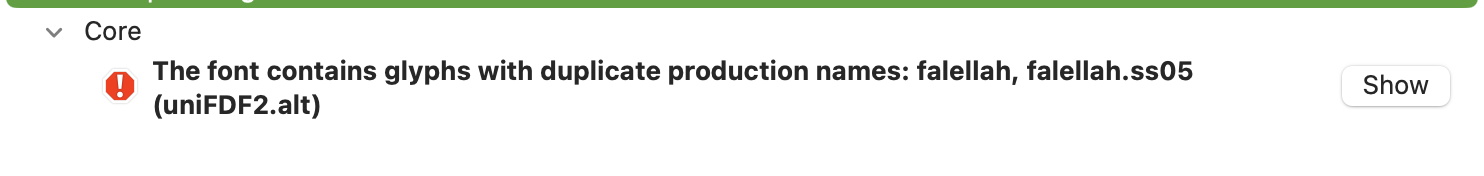 I created a glyph called falellah then duplicated it with ss05 suffix to make other option with different dots shape but when export the font this error appears: