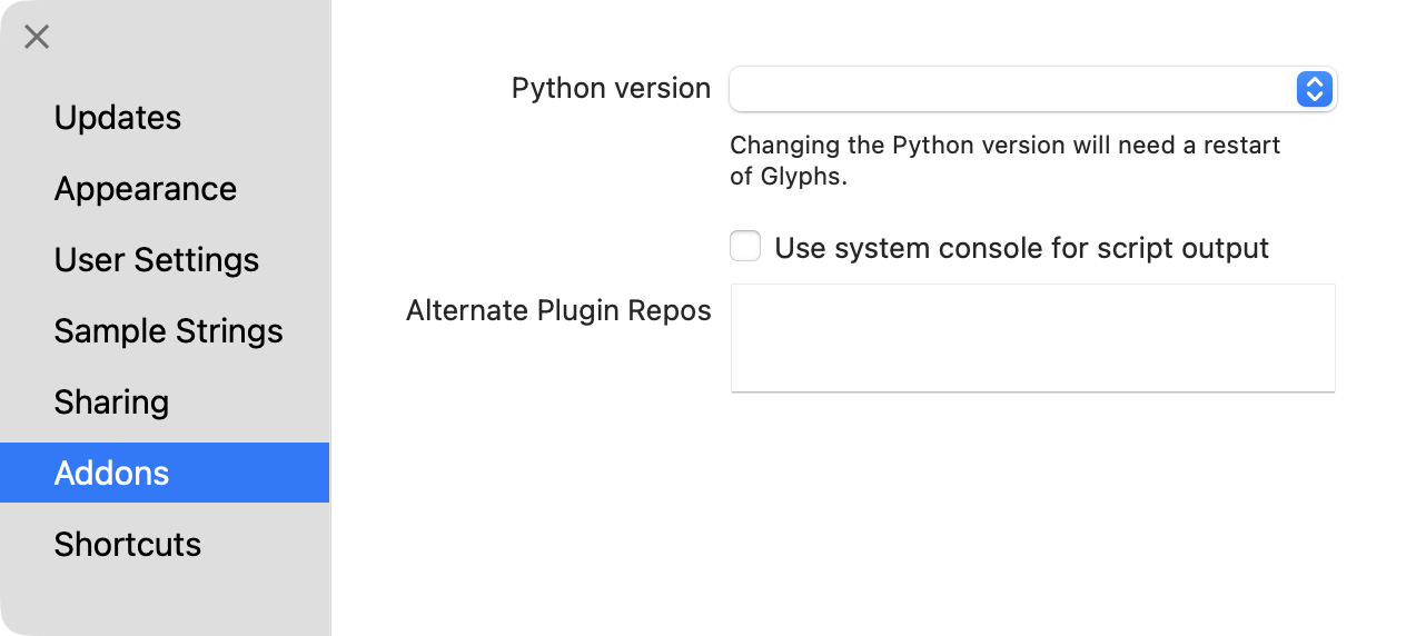 I just installed Glyphs on a new machine, macOS with Tahoe 26.0.1. Python 3.13.7 is installed. But when I run Glyphs, no version of python is shown in properties in the dropdown menu.