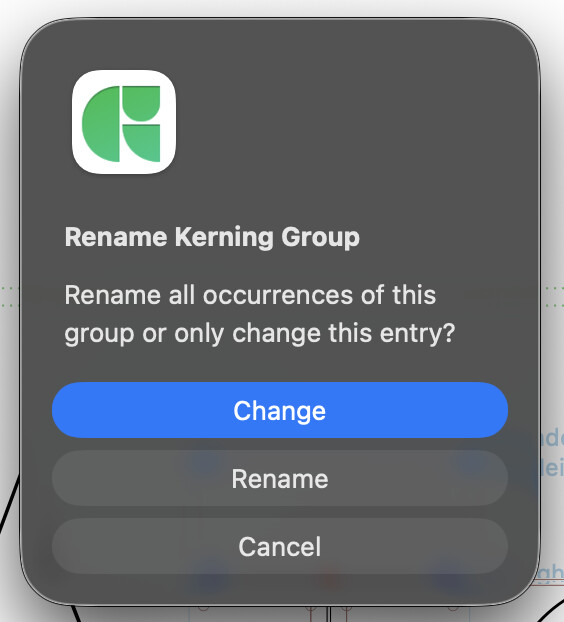 To invoke this dialogue, go to Window > Kerning and rename a kerning group.