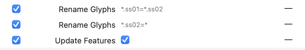 This is why for the italics, I simply want to “rename” the feature ss01 to ss02. Is this possible via custom parameter? Using Remove Features and Add Feature is a bit unelegant and doesn’t auto-update (which, as you may know, is really unbearable for me). Plus, it seems I can’t give it a description, and it will be in the wrong order.