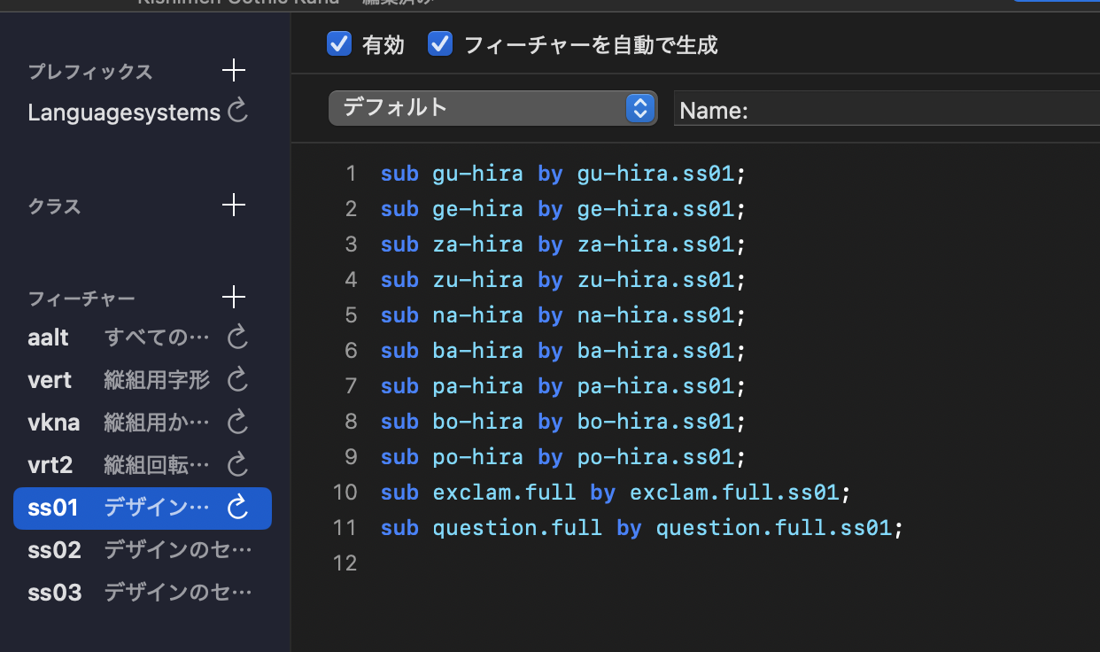 When I create alternate glyphs such as gu-hira.ss01, Glyphs automatically generates a feature like this:
