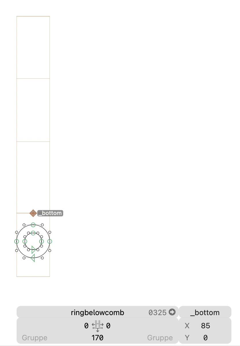 ringbelowcomb._bottom (also mit Underscore am Anfang) zentral über der Form, am besten auf der Grundlinie.bottom (ohne Underscore). Bei den lateinischen Basisbuchstaben gehört bottom zum Standardrepertoire, also kannst du alle A-Z und a-z auswählen und mit gedrückter Option-Taste ⌥ Glyph > Set Anchors for all Masters (⌘⌥U) wählen. Glyphs wird dann die fehlenden Standard-Anker ergänzen.Dann die Schrift neu exportieren. Das Programm, in dem du die Schrift benutzt, muss „Mark Attachment“ unterstützen.