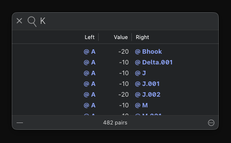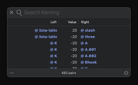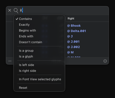 Typing “K”, “L”, “M”, or “R” group name in the Search field in the Kerning panel doesn’t provide the selection of that kerning group (kerning of which is presented there), although it works fine with any other group name except of those four.