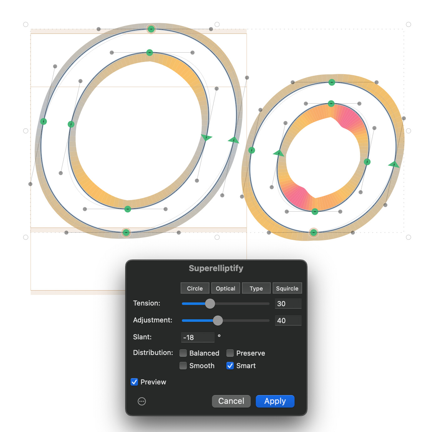 The Slant parameter (-45° to 45°) makes Superelliptify work better on slanted and italic letterforms. Setting it to the same angle as the slanted glyphs produces results equivalent to superelliptifying upright contours and slanting them afterwards (thus introducing similar problems to slanting the upright contours).