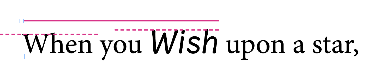 I’m trying to figure out how to adjust the space indicated below from the solid magenta line to the dashed magenta lines. When the word “Wish” is removed, the W in “When” is flush against the top solid magenta line (InDesign), but when the “Wish” font is used, both get “bumped” down.